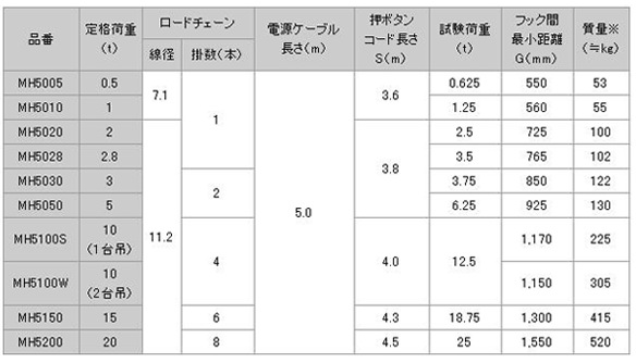 日本日智MH-5型電動葫蘆技術參數: