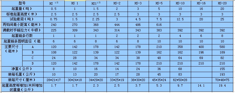 無錫太湖HS型系列手拉葫蘆技術(shù)參數(shù):
